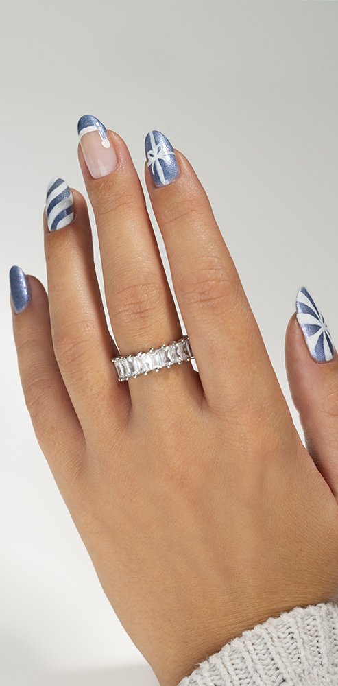 Tauche den Pinsel erneut in die Farbe “Sugar rush” N°259 und zeichne auf Deinen Zeigefingernagel zwei dünne Linien, die sich mittig auf dem Nagel treffen, sodass ein Kreuz entsteht. Platziere auf der Schnittstelle eine kleine Schleife, um den Geschenk-Look abzurunden.