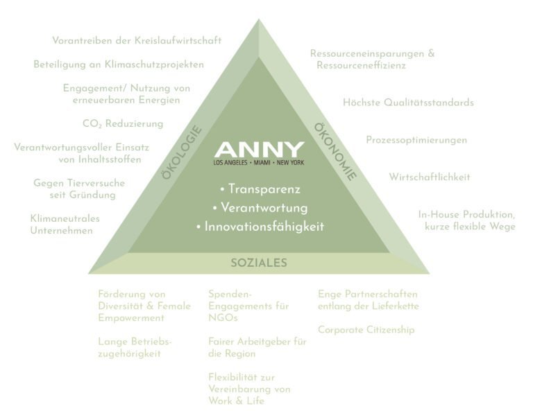 ANNY pledges to meet its social, ecological and economic responsibilities for employees, customers and future generations. With our values in mind, greater transparency, responsibility and innovative capability, we want to further refine our processes and products step by step.