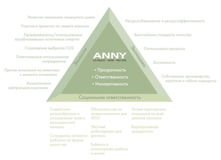 ANNY берёт на себя социальную, экологическую и экономическую ответственность перед сотрудниками, клиентами и будущими поколениями. Помня о наших ценностях, большей прозрачности, ответственности и инновационных способностях, мы хотим шаг за шагом оптимизировать наши процессы и продукты.