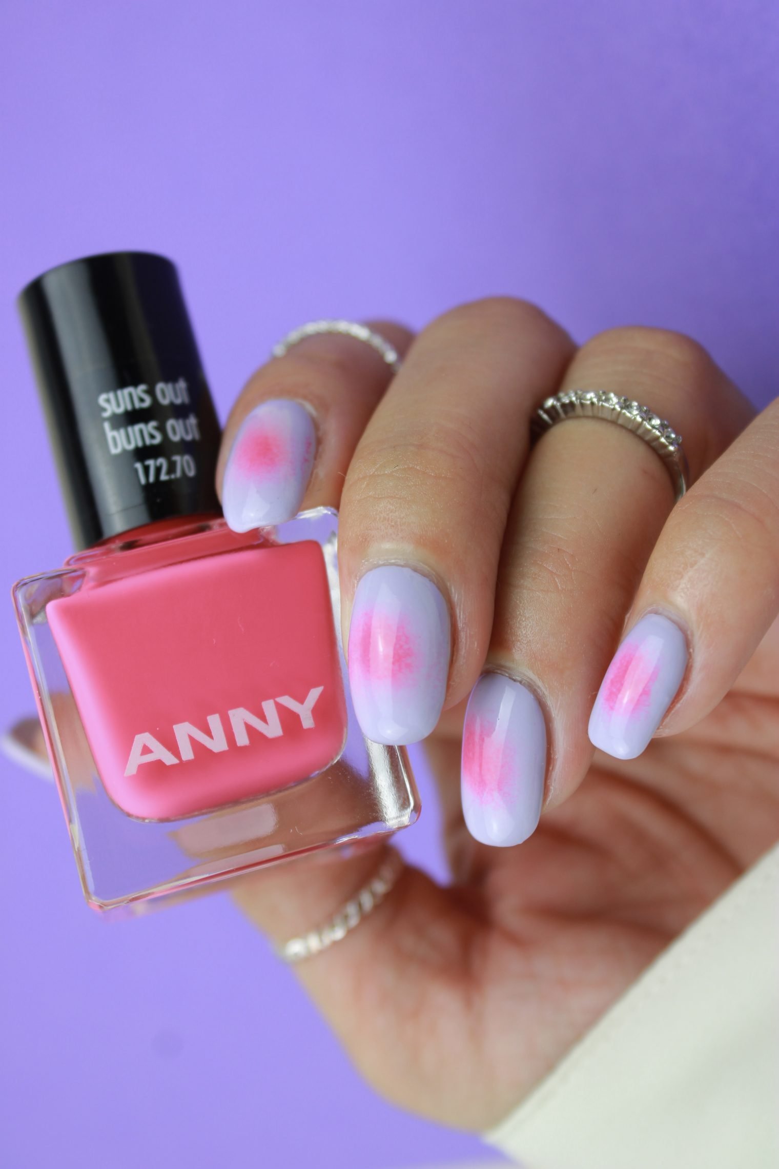 Нанеси на маленькую губку цвет «Lilac district» № 212. Помести каплю оттенка «Suns out burns out» № 172.70 в середину фиолетового мазка.
