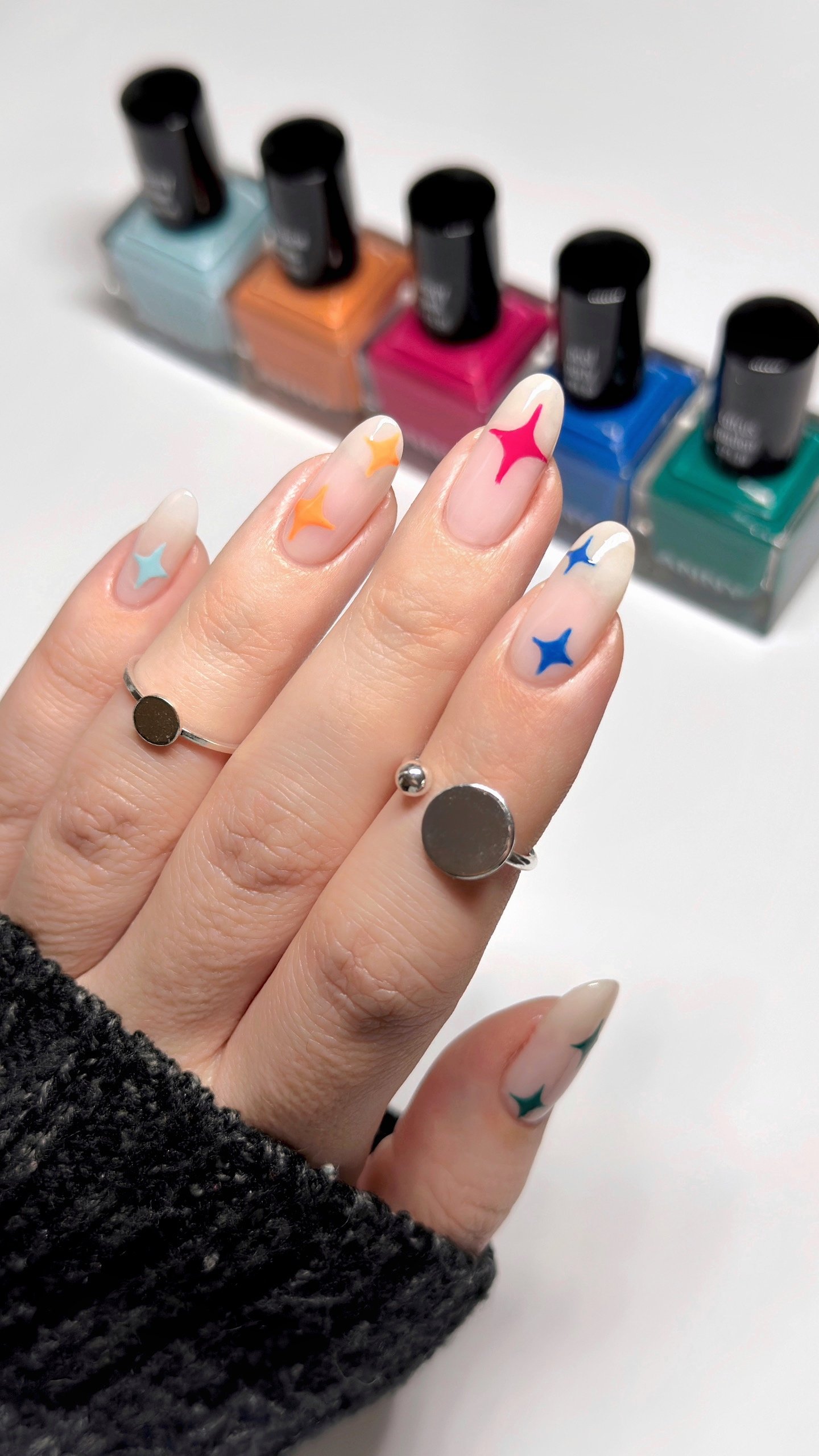 Повтори это действие на каждом ногте, используя другие цвета. Особенно подходят: «Stormyblue» № 383,50, «Sunshinevibes» № 170,35, «Poppypink» № 173,50 или «Poolparty» № 384,60.