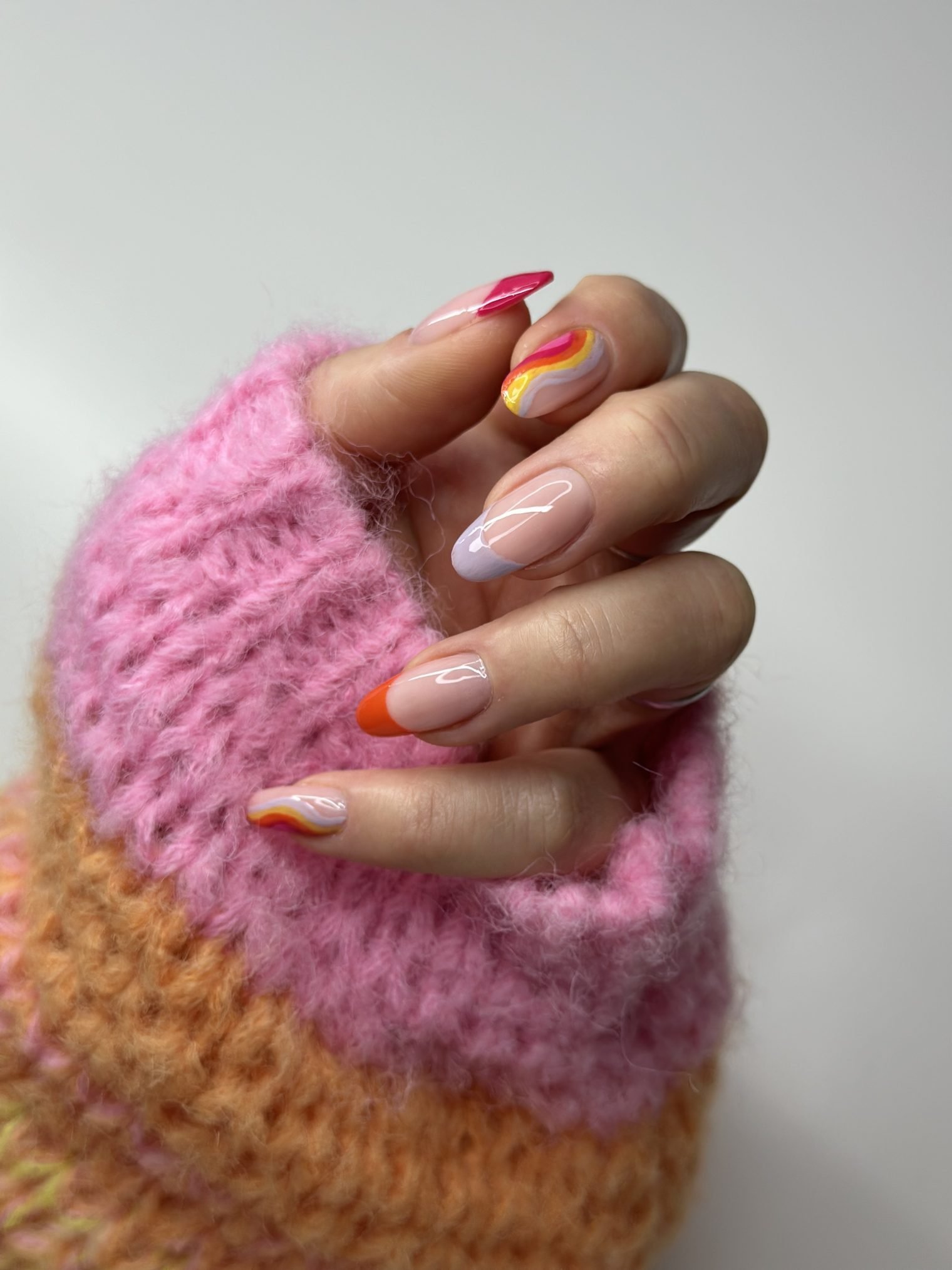 Теперь тонкой кистью нарисуйте изогнутый радужный вихрь на указательном пальце и мизинце. Используйте следующие цвета в последовательности: “Pimp my city” N°170.28, “Sun & fun” N°373.90, “Lilac district” N°212, “Poppy pink” N°173.50 и “Yes, I do” N°177.80.