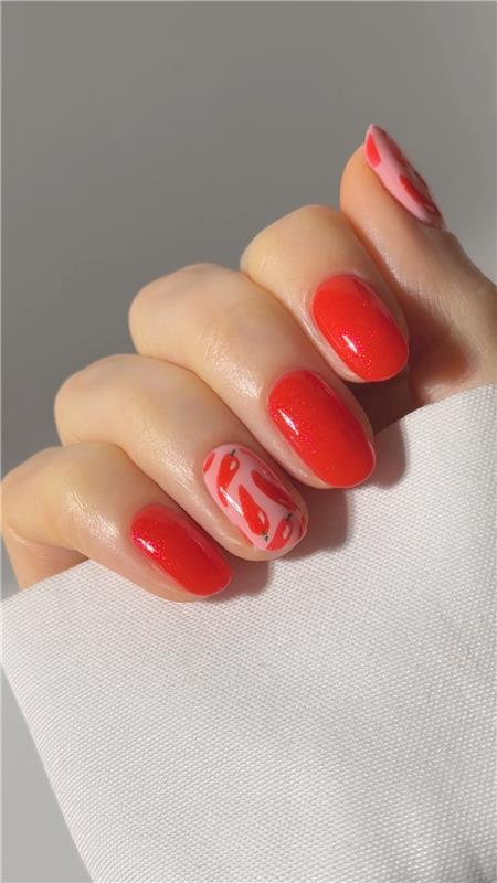 Окунитесь в атмосферу яркого фестиваля с ногтями Spicy Chilli Festival Nails! Этот огненный дизайн сочетает в себе блестящий красный цвет и игривые узоры чили на нежно-розовом фоне – абсолютное украшение для Coachella и co. Позвольте вашим ногтям сиять с этим образом и перенесите жаркое фестивальное настроение на кончики пальцев!