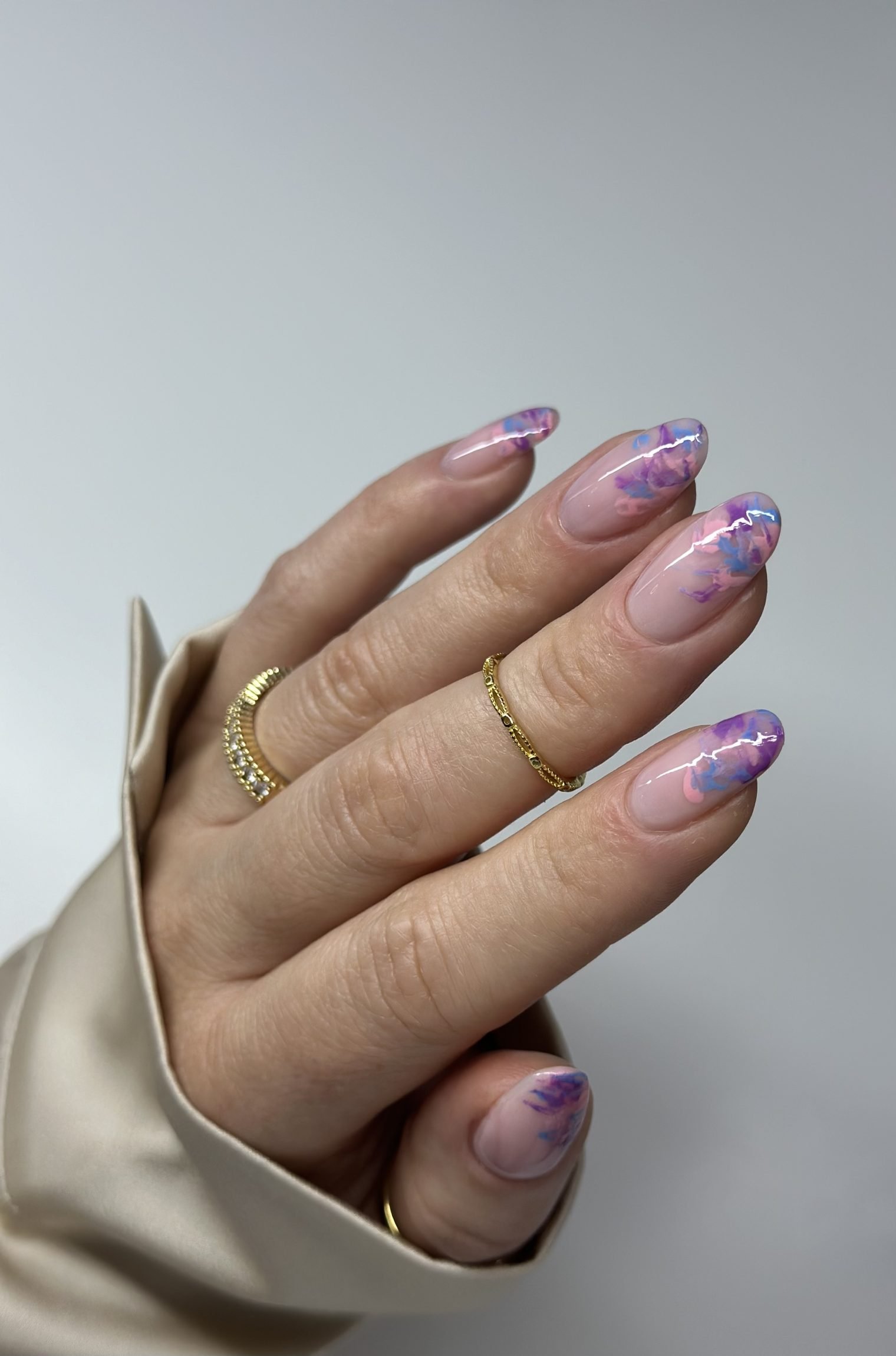 Используя цвета “Летучий лосось” N° 244.40, “Ледниковый синий” N° 403.50 и “Полуночная слива” N° 213.50, поставьте точки разного размера на кончиках ногтей.