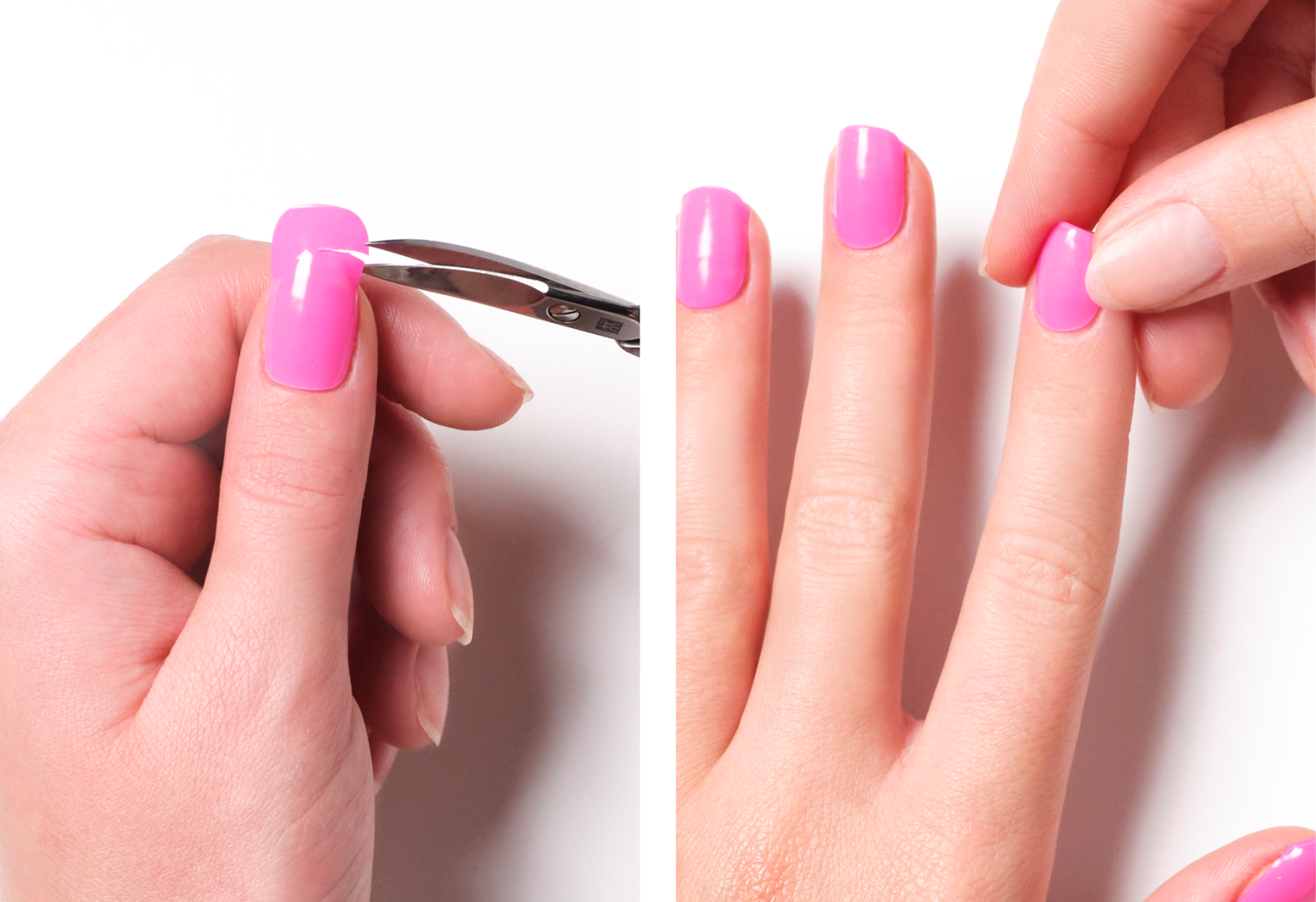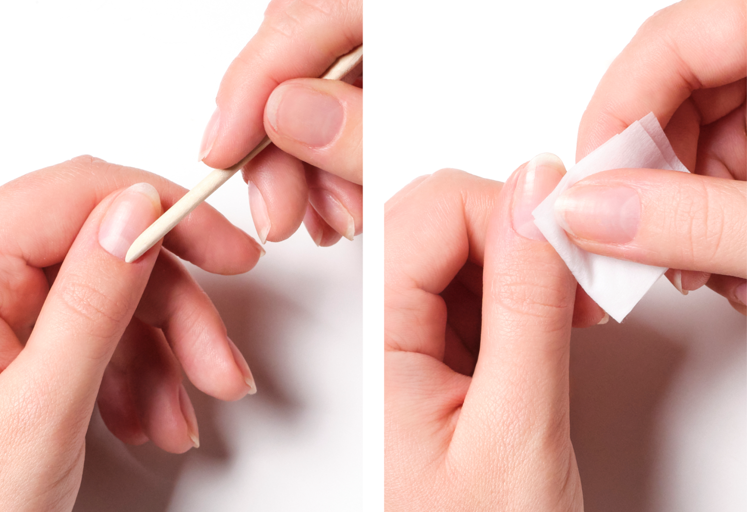 Тщательно очистите ногти и удалите старый лак. Осторожно отодвиньте кутикулы маникюрной палочкой. Для оптимальной стойкости можно протирать ногти спиртовой салфеткой.